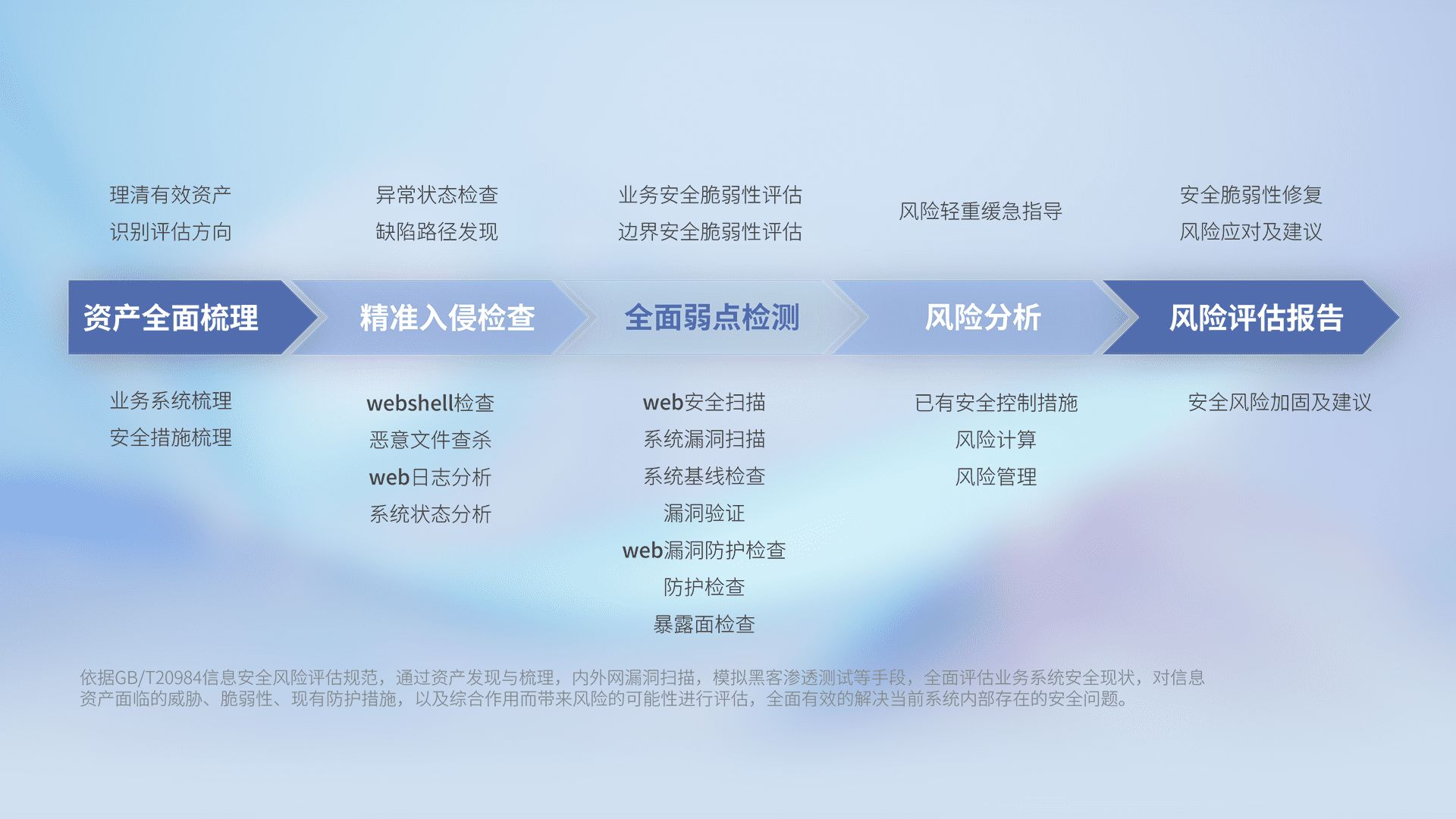 针对客户行业特性,,,,以专业的安全服务+多厂商联合解决方案提供专属的一站式安全管理服务,,,帮助客户全面感知网络空间威胁,,,基于识别、、、、检测、、、分析、、防护、、、、监测、、响应的服务理论模型,,,,从方案咨询、、、集成交付、、、、评估验证、、、优化加固、、、运维运营,,,致力于为客户提供完整的闭环管理式安全服务。。。。以实战经验为客户打造高抵御风险的安全体系,,,帮助客户发现威胁、、、对抗威胁、、、、处置威胁,,,不断积累安全对抗能力,,持续保障数字化安全。。。